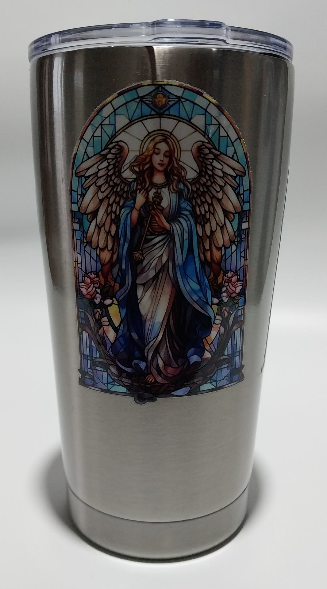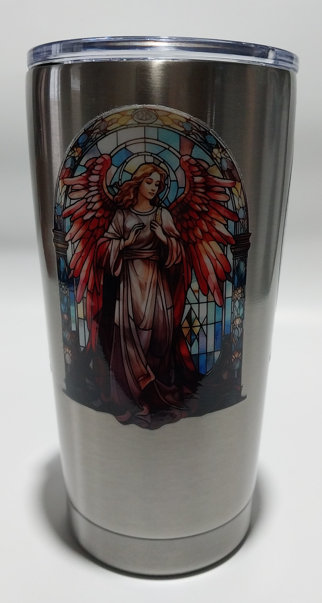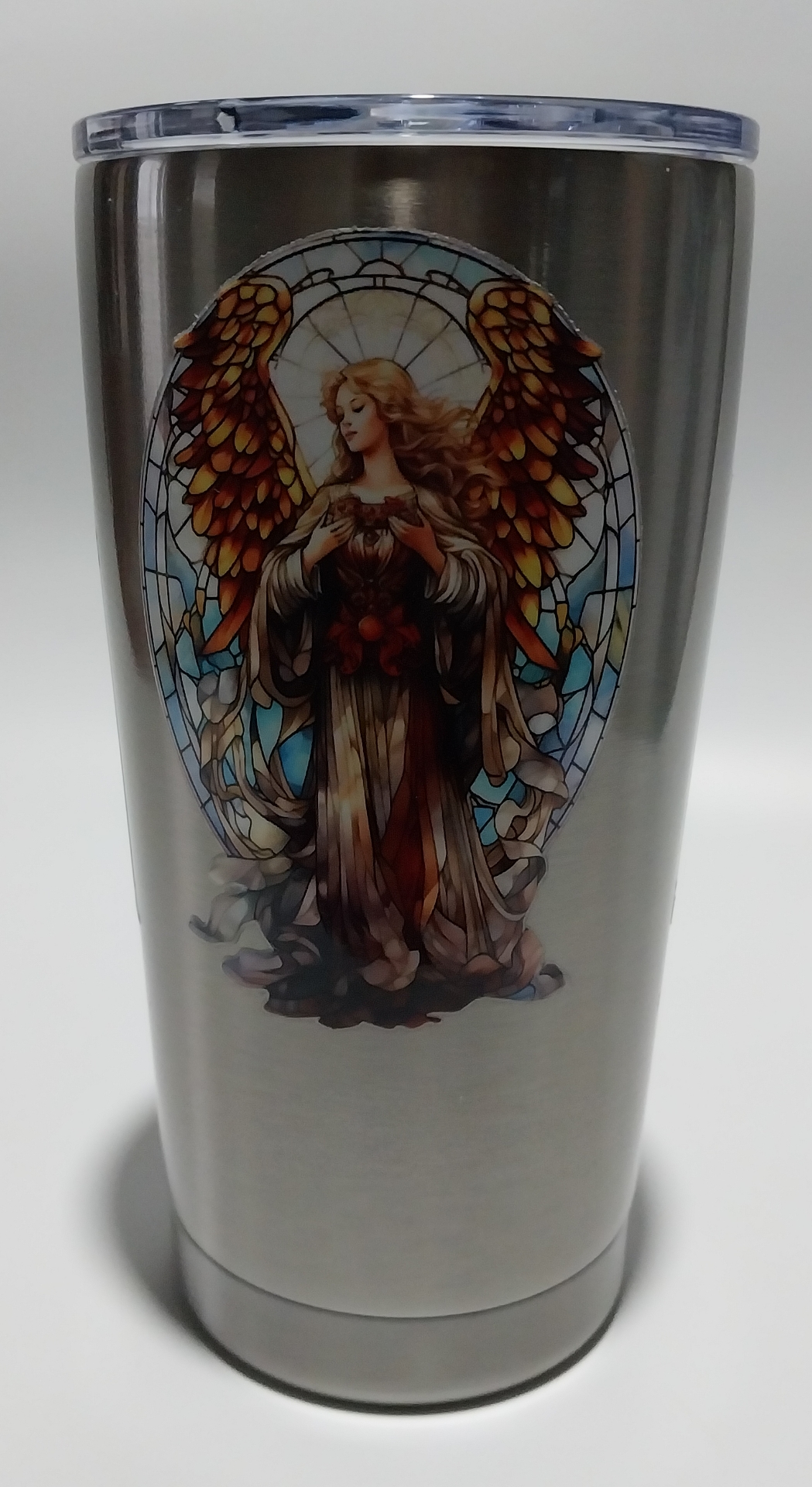 This Angel Tumbler has 3 Angel stained-glass designs. On a silver tappered tumbler.