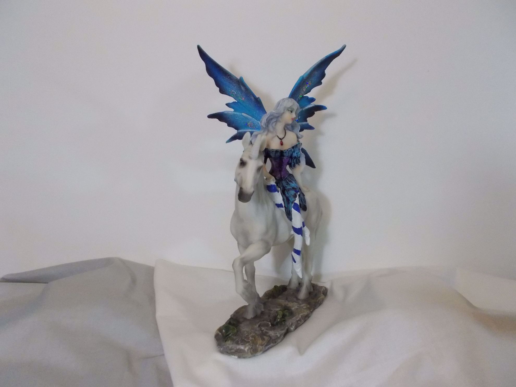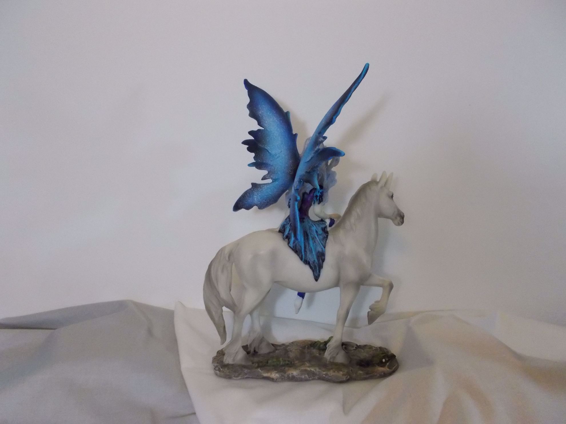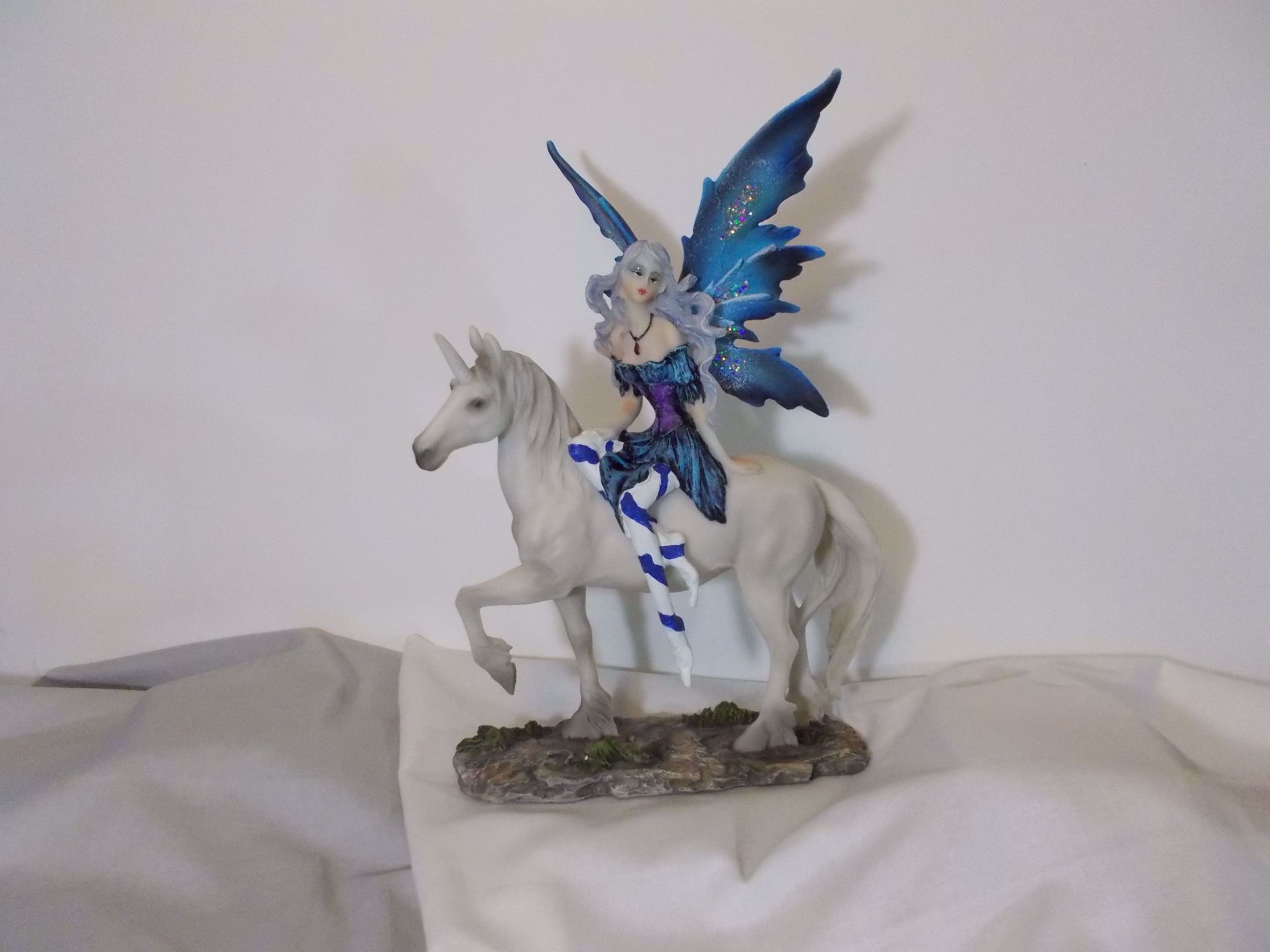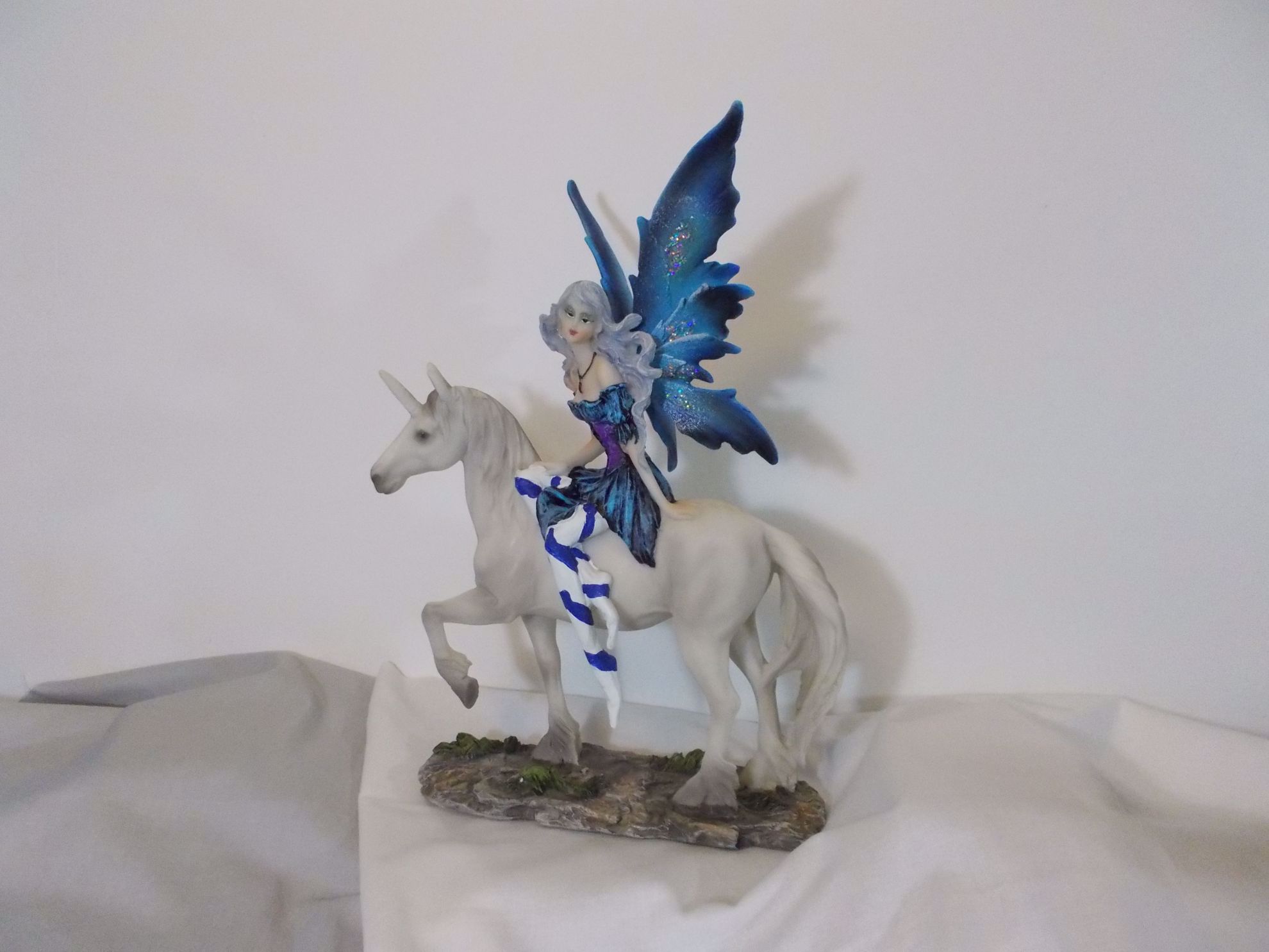 This is a poly resin figurine. It is a blue fairy sitting atop a white unicorn. The figurine stands 11? tall and is 8? long and the figurine is hand painted. The detail in this figurine is exquisite with the detail in the features of the fairy, from her beautiful blue wings with sparkle highlights to the life like detail in the design of the unicorn. This without a doubt would make any collector of fantasy figurines happy to have.