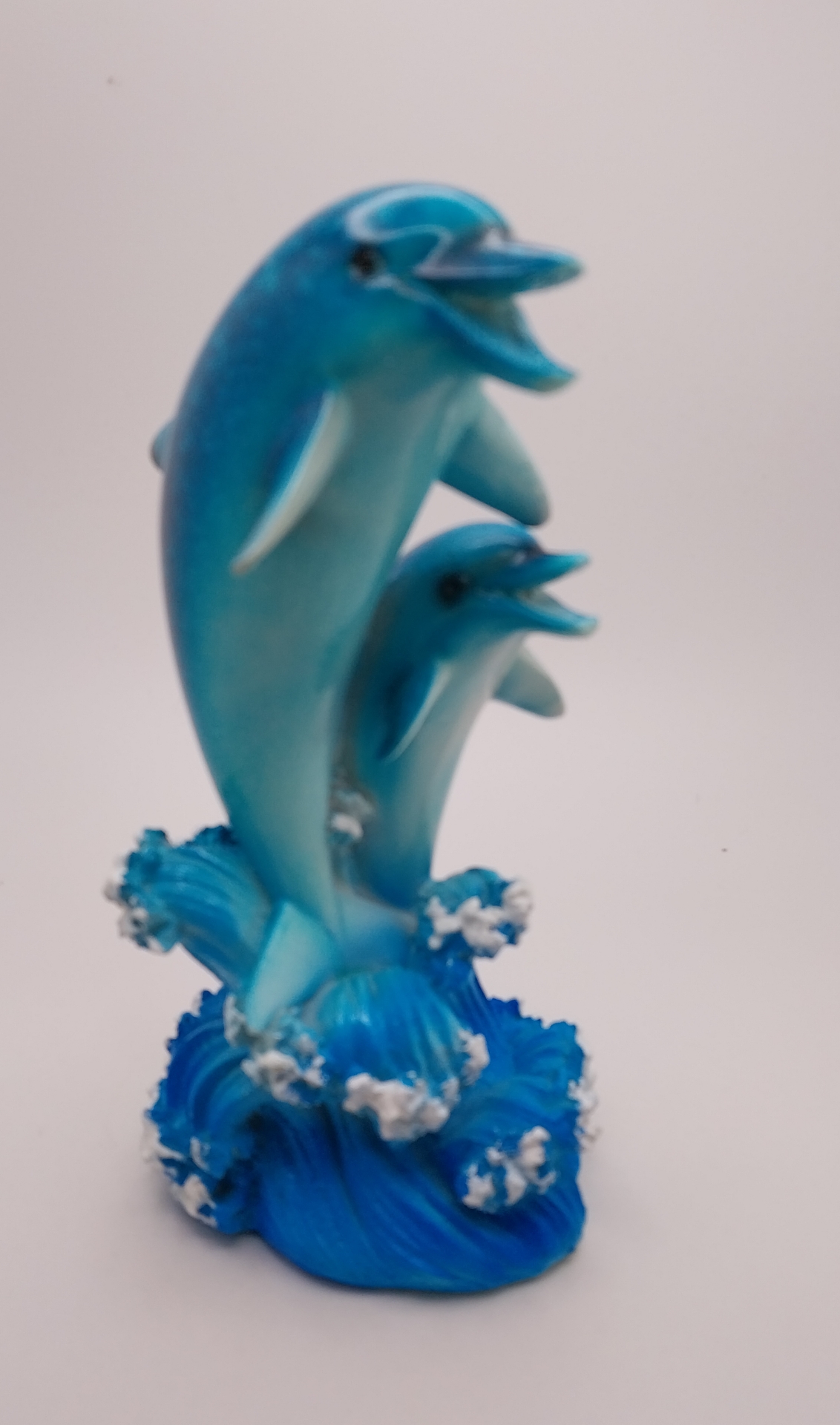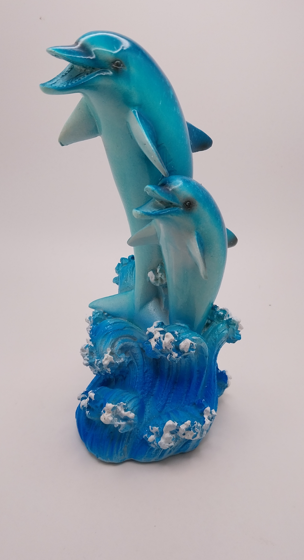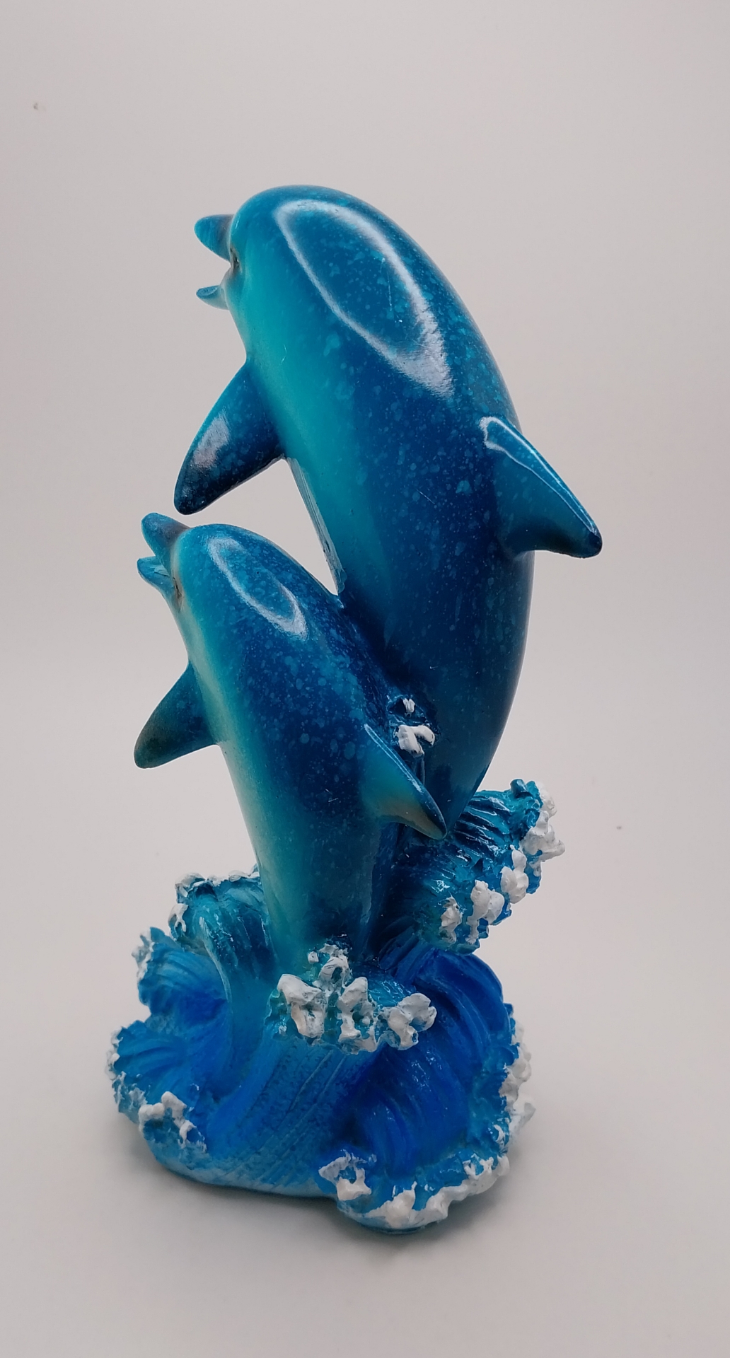 Blueish in color, Mother and Baby Dolphin jumping out of water
