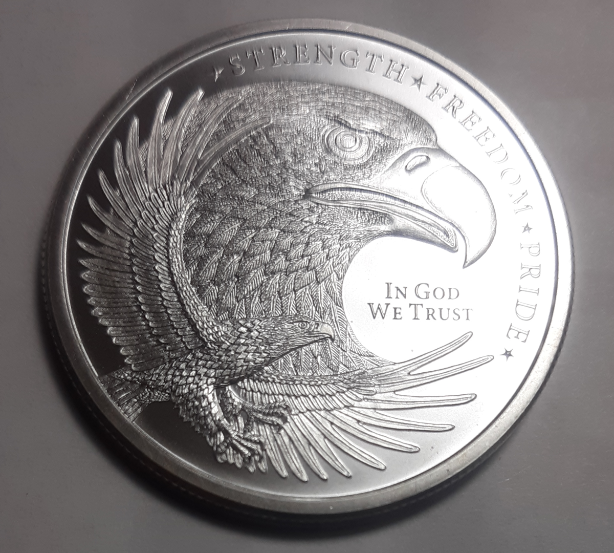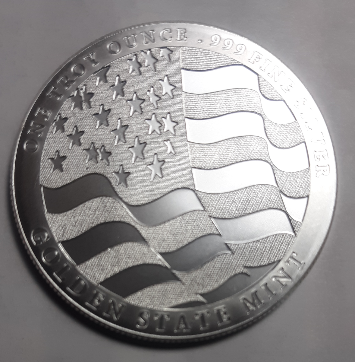 This beautiful Silver Eagle design, has on the obverse, you will find both the head of an eagle and the spread wings of a soaring eagle. Around the upper right are the words Strength, Freedom, Pride and you will also find the words In God We Trust. On the reverse side, you will find a waving flag, and around the rim the words One Troy Ounce .999 Fine Silver and Golden State Mint.