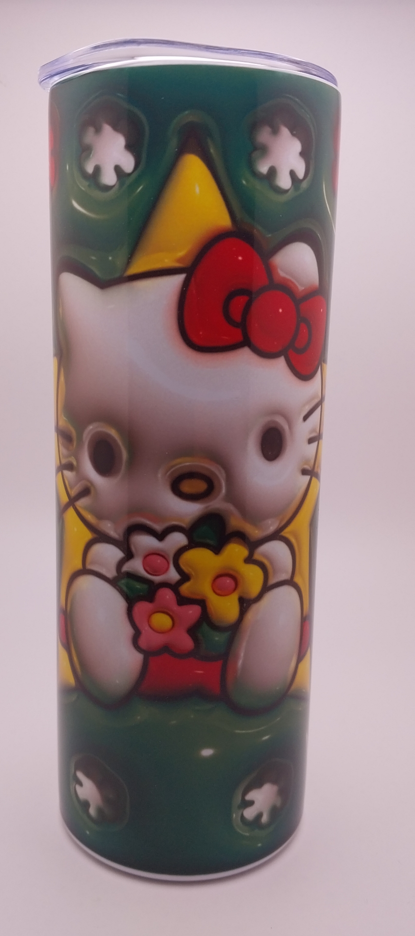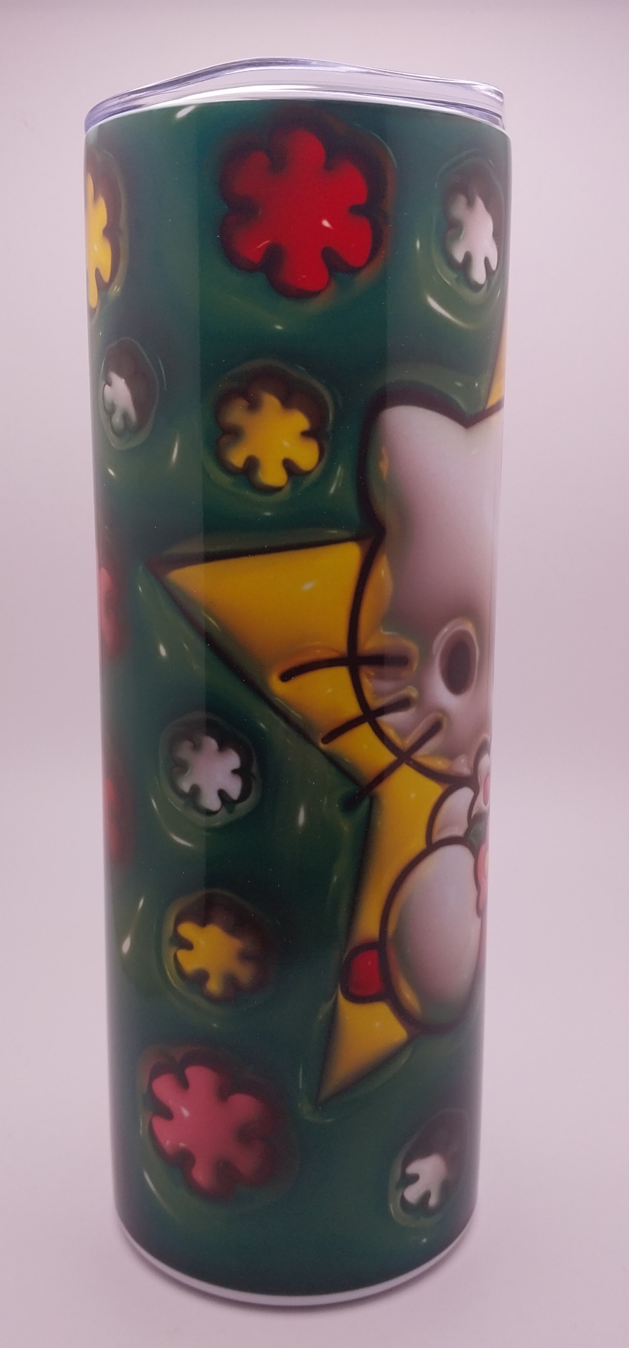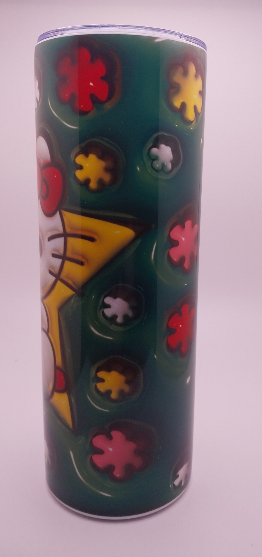 This hello Kitty tumbler depicts, Hello Kitty with green background with stars.