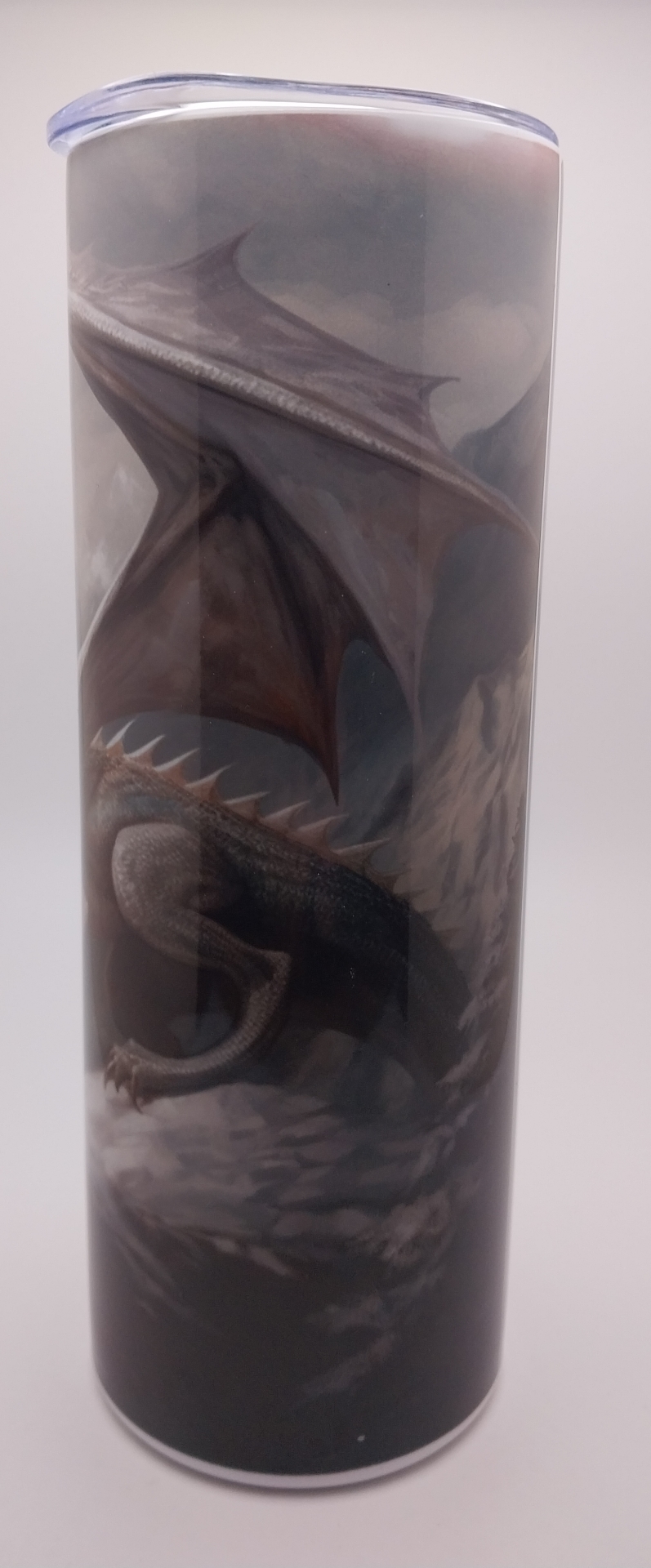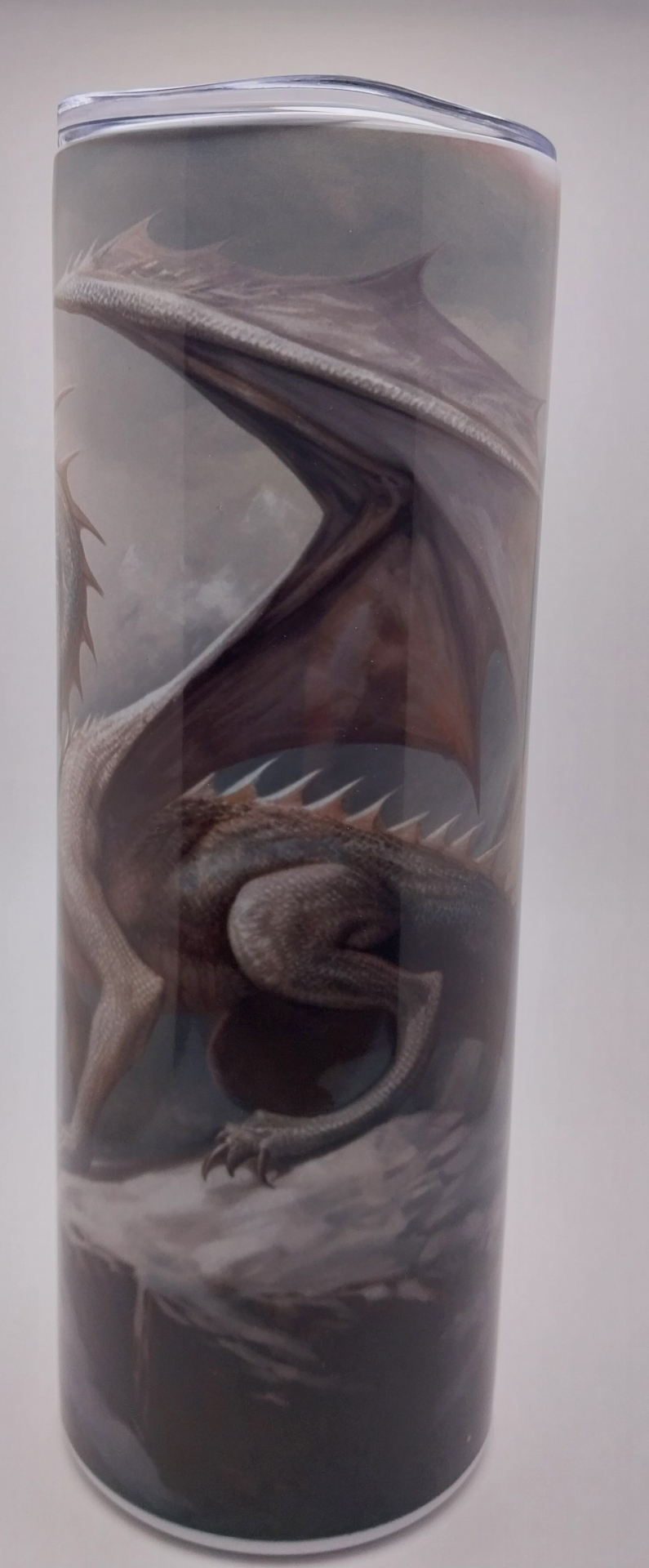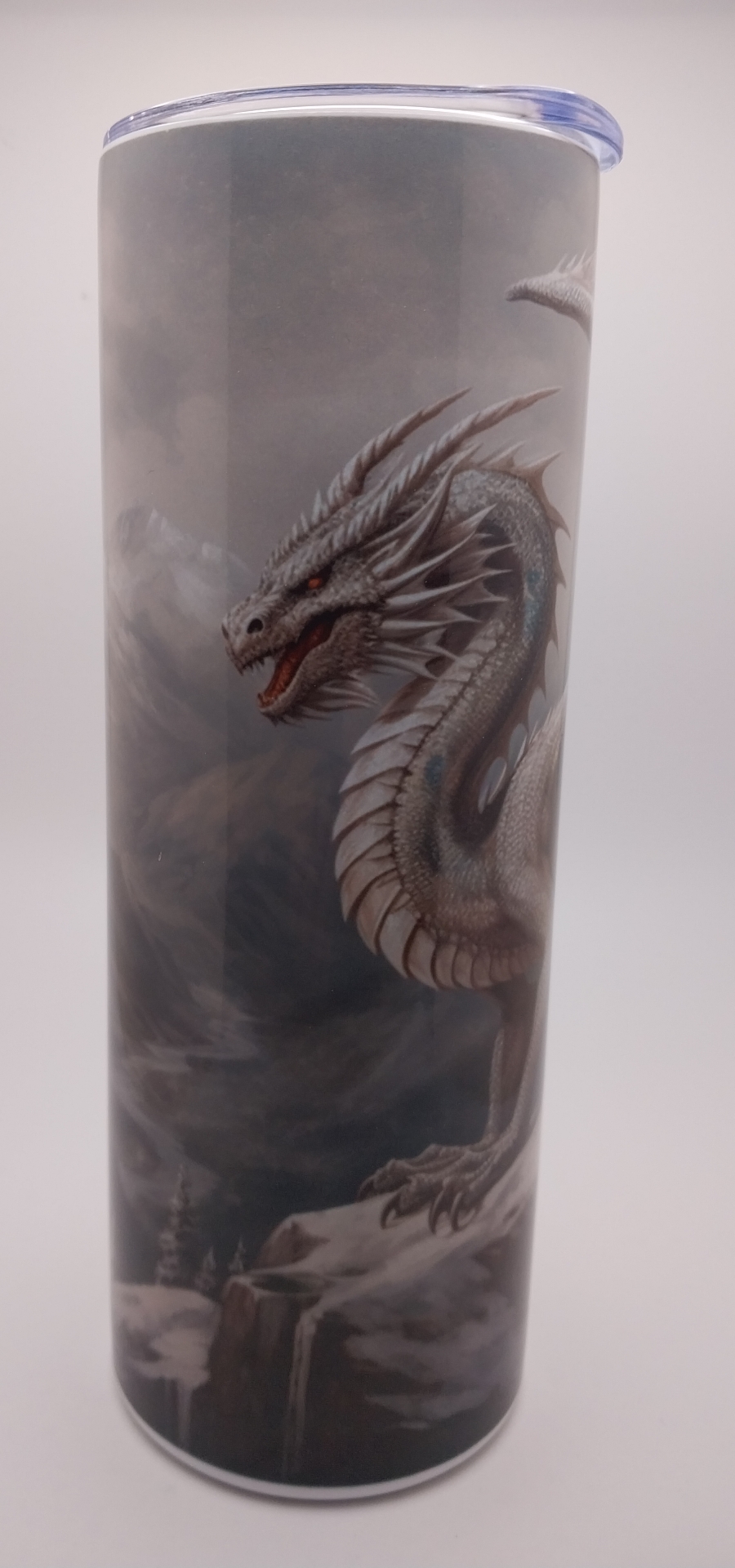 This fantasy sitting with, Ice Dragon standing on Mountain Cliff, over looking the mountain valley.