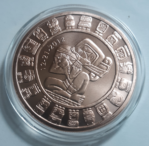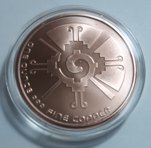 1 oz Mayan Calendar Copper Bullion Round commemorates the legendary Mayan civilization of ancient Central America. This magnificent copper round features a kneeling Mayan warrior surrounded by Mayan symbols on the head. The reverse side depicts a stunning Mayan pictograph of the sun.