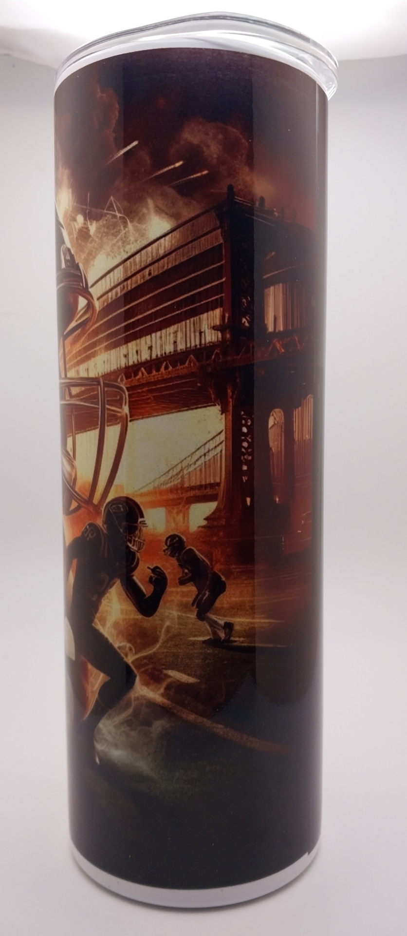 This Multi-Color Depiction of NY Jets Football Team with City Scape Background. 20 oz Steel Tumbler