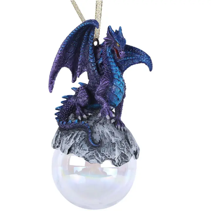 This striking ornament will add a touch of the fantastic to your Christmas tree, or anywhere else you choose to hang it! The collectible features a dragon designed by artist Ruth Thompson. The beast is done in shades of purple and blue, and perches upon a rock. The stone seems to flow over the top of a pearly, iridescent globe, and a ribbon has been included for easy hanging.